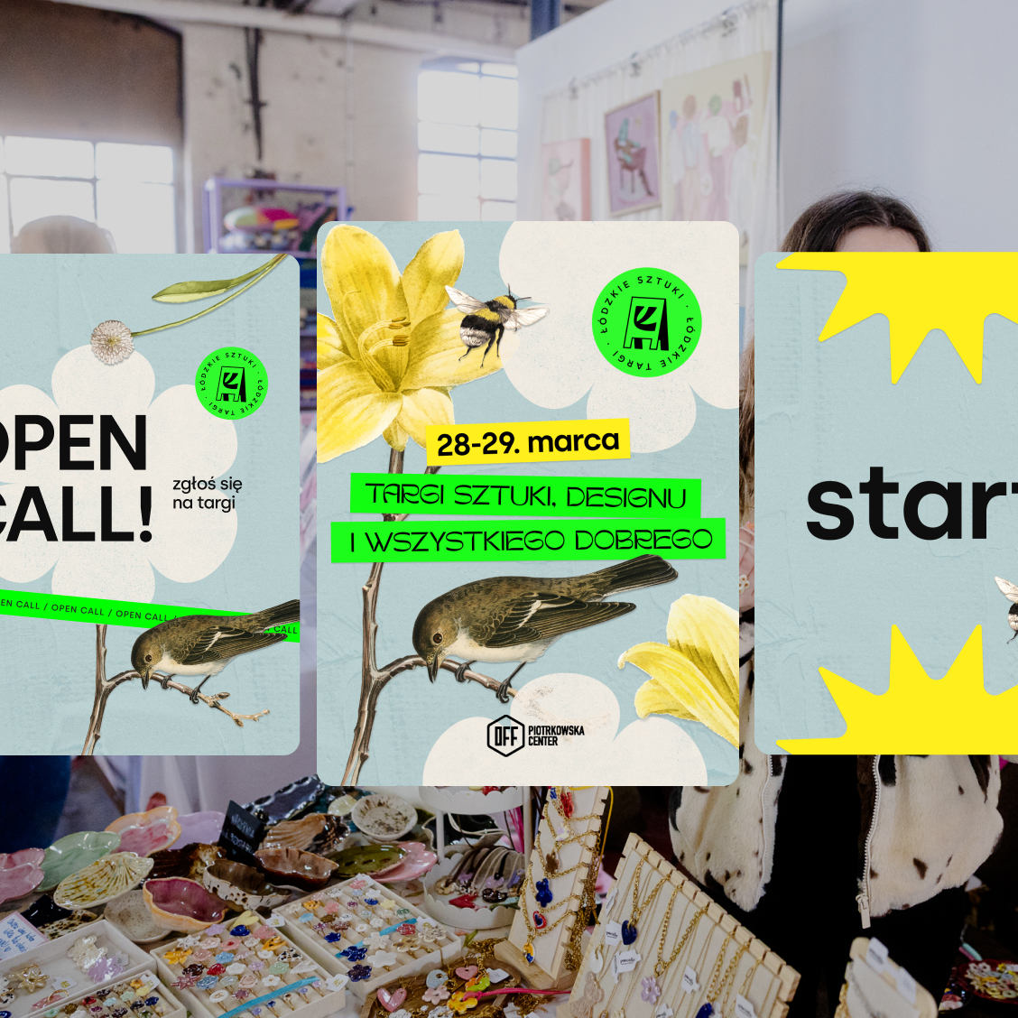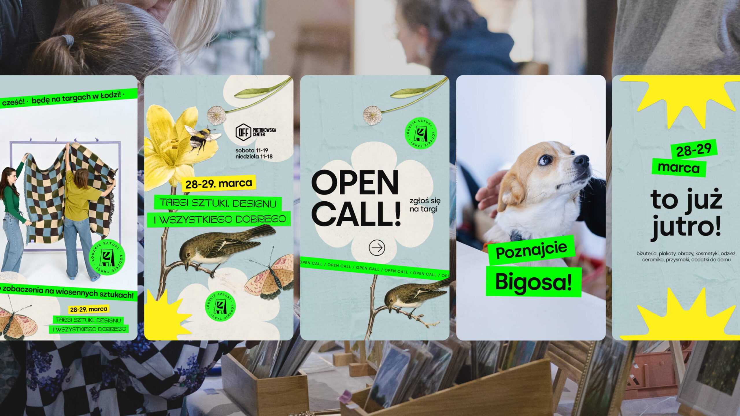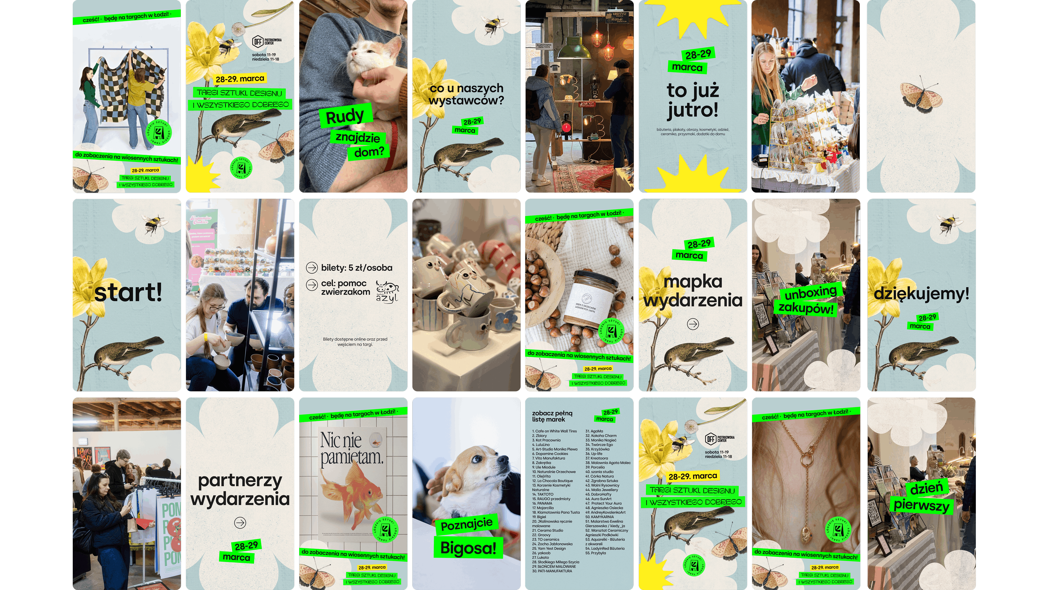 Zaprojektowałyśmy elastyczny system identyfikacji wizualnej oparty na stałej siatce, która porządkuje komunikację i pozwala na jej szybkie skalowanie w różnych kanałach, od social mediów po materiały drukowane. Jednocześnie każdej edycji nadawany jest indywidualny motyw wizualny. W przypadku edycji wiosennej był to kolaż. Stała struktura i zmienny motyw pozwalają zachować balans między rozpoznawalnością a świeżością komunikacji.