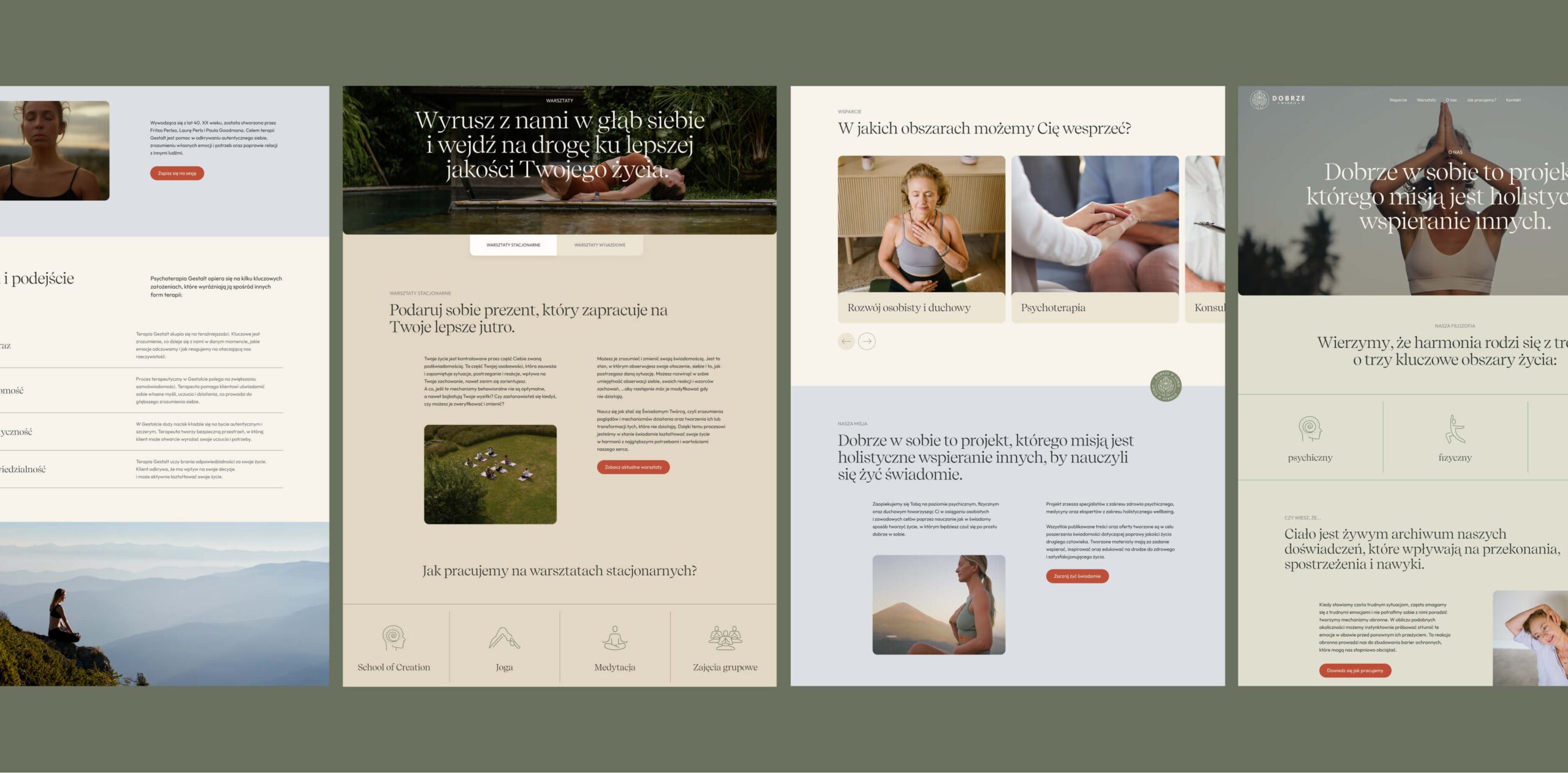 To przestrzeń online, która edukuje, wspiera i zaprasza do pogłębienia kontaktu ze sobą. Klarowna struktura strony i harmonijny design ułatwiają poruszanie się po treściach i usługach. Projekt wspiera ideę psychoterapii dostępnej i zrozumiałej – z myślą o dobrostanie ciała i umysłu. Każdy element – od palety kolorystycznej po układ treści – został zaprojektowany tak, by budować poczucie bezpieczeństwa, bliskości i zaopiekowania. Projekt Dobrze w Sobie jest przykładem na to, jak poprzez projekt graficzny i UX można tworzyć wspierające, cyfrowe środowisko dla rozwoju i refleksji.